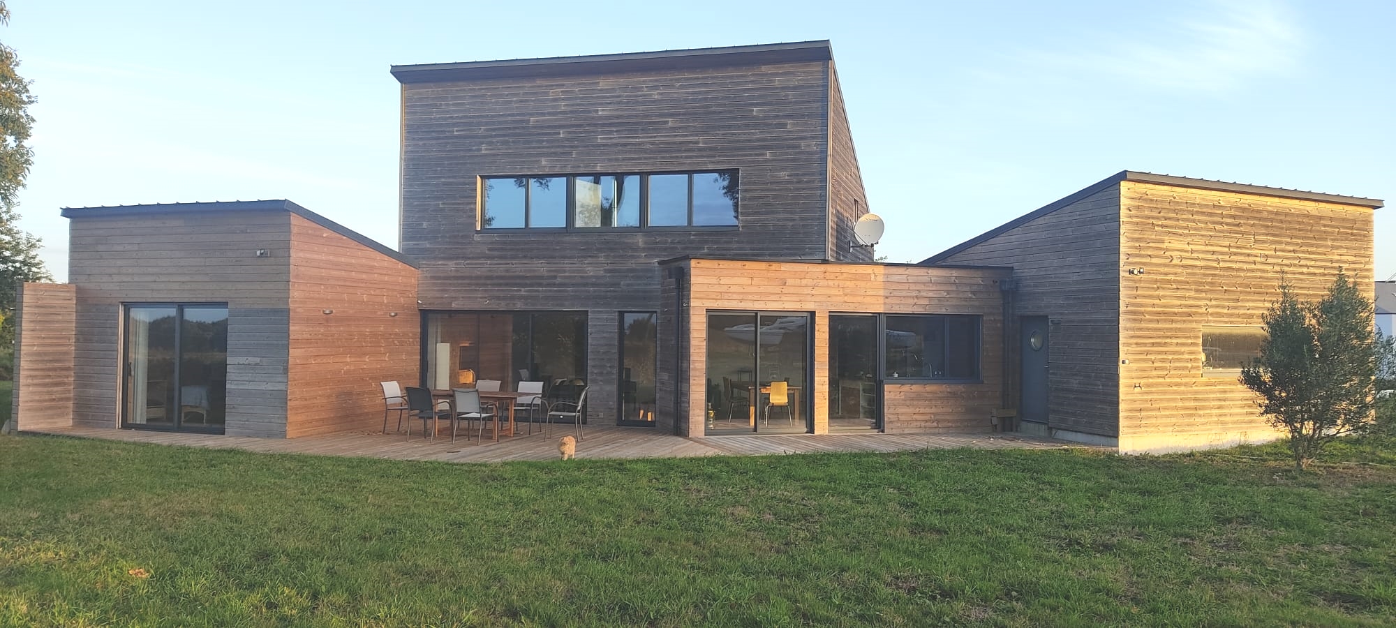 Le rez-de-chaussée est en maçonnerie traditionnelle, à l’exception du volume du séjour fait de bois et de verre, et l’étage est en ossature bois + bardage Douglas.