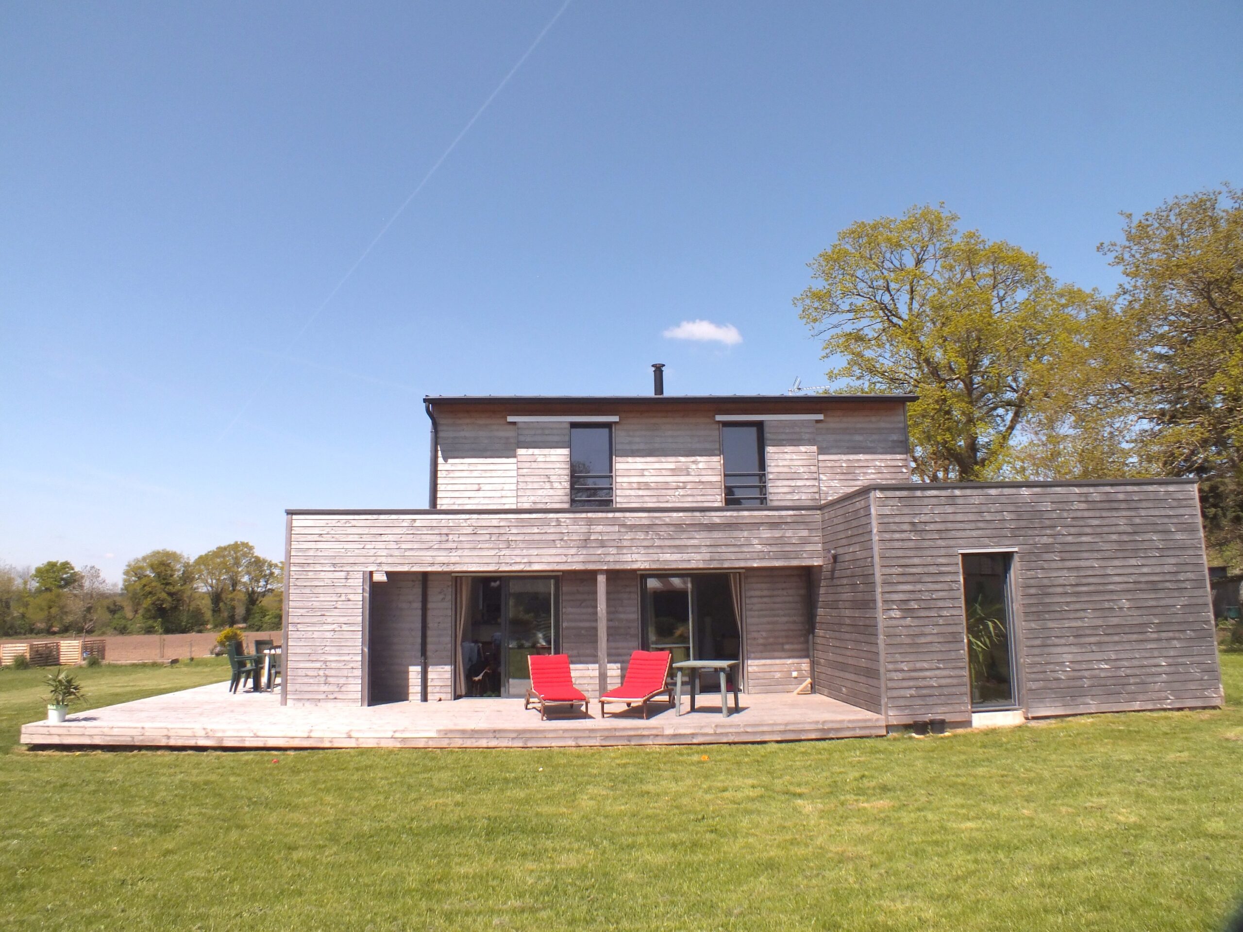 Construite dans un « eco-lotissement » avec quelques prescriptions respectueuses de l’environnement : maçonnerie « bio-briques », récupération de l’eau de pluie, chauffage par aérothermie , bardage bois en Douglas non traité. Conception « bioclimatique » avec une grande quantité de vitrages côté Sud pour emmagasiner les calories gratuites du soleil de l’hiver et des demi-saisons, et en même temps protégés du soleil de l’été par une « casquette ».