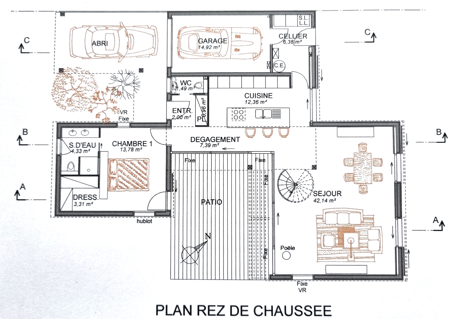 Le confort de vie projeté pour cette maison est renforçé par l’utilisation de matériaux sains et naturels : structure en brique isolante + enduit à la chaux, isolation en laine de bois, doublages en Fermacell, chauffage aérothermique, VMC double-flux … etc