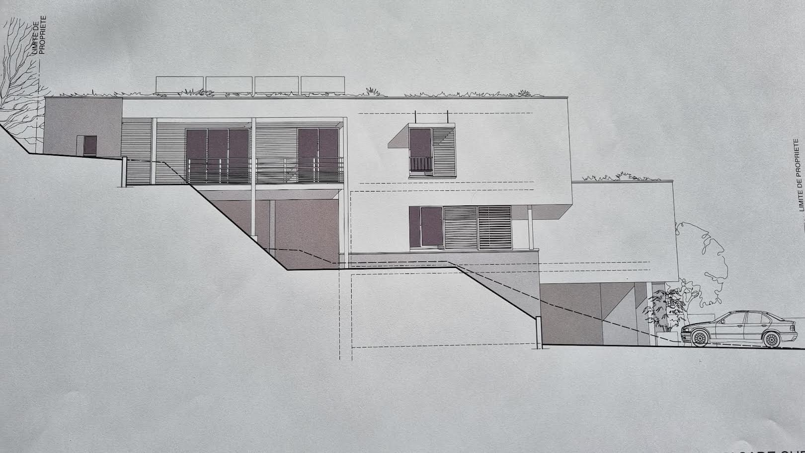 La topographie du terrain impose au projet 3 niveaux , qui se traduisent par un jeu de plusieurs volumes cubiques