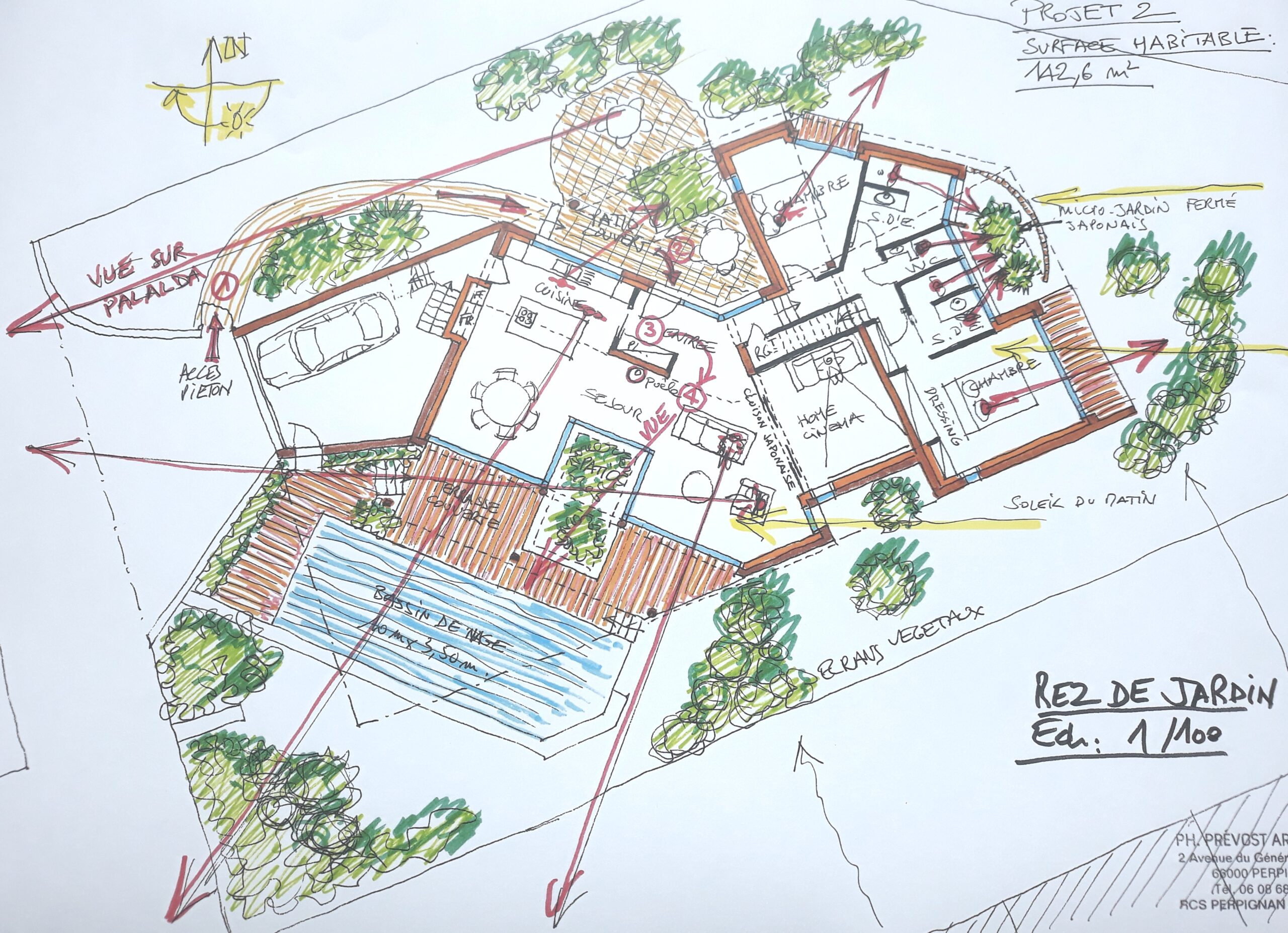 Contexte : Terrain en légère pente avec vue sur les collines du Vallespir. Le client cherchait une maison lumineuse, performante thermiquement et en harmonie avec la végétation locale.