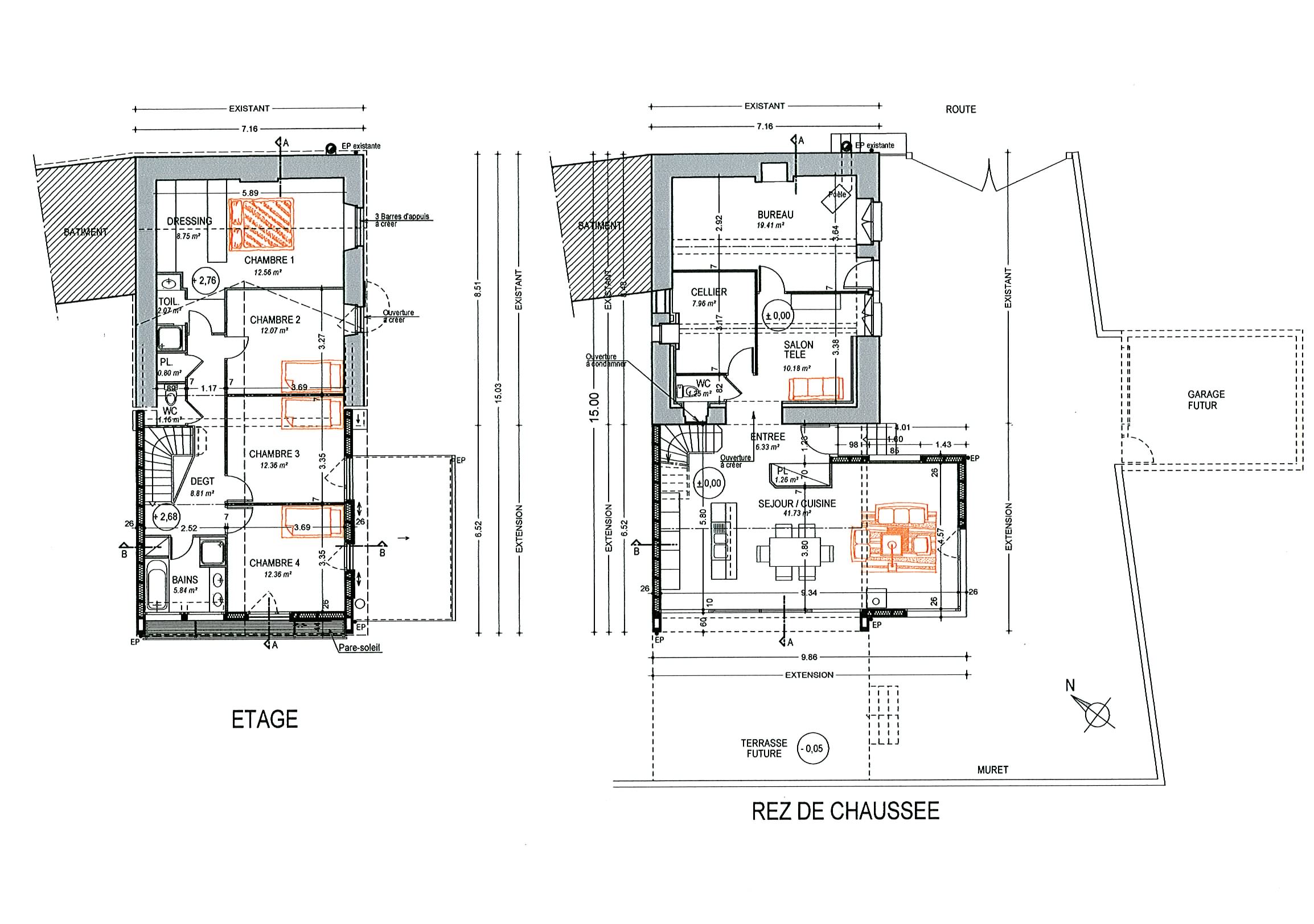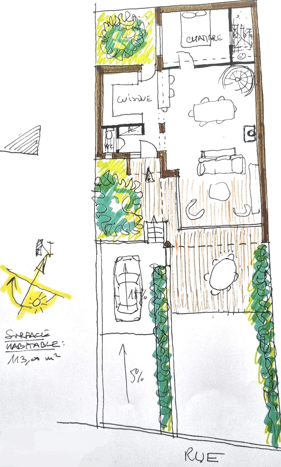 Contraintes : Orientation à optimiser pour les apports solaires, faible emprise au sol, règlement d’urbanisme strict.